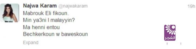 وغردت كرم عبر "تويتر" تعبيرا عن حبها لجمهورها:" مبروك إلي فيكن، مين يعني الملايين، ما هنِّ إنت، بشكركن وبوسكن"، كتبت هذه الكلمات بالأحرف الإنجليزية أو ما يسمى بلغة الـ"فرانكو آراب".