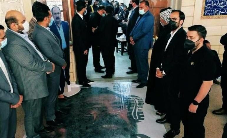 وبحسب صورة التقطت داخل مجلس عزاء القاضي العراقي محمد العريبي، فإن صورة صدام حسين وضعت على الأرض في مدخل قاعة المجلس، وداس عليها المعزون.