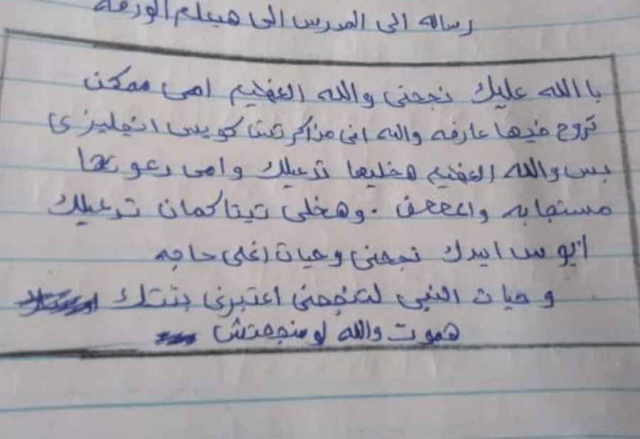 وجاء في الرسالة: “بالله عليك نجحني والله العظيم أمي ممكن تروح فيها، عارفة والله إني مذاكرتش كويس في الانجليزي، بس والله العظيم هخليها تدعيلك وأمي دعواتها مستجابة، نجحني وحياة أغلى حاجة عندك، وهخلي تيتا كمان تدعيلك، أبوس إيدك نجحني وحياة أغلى حاجة عندك وحياة النبي لتنجحني وتعتبرني بنتك هموت والله لو منجحتش”.