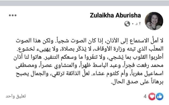 وكتبت أبو ريشة في منشور على صفحتها الرسمية في موقع “فيسبوك”: “لا أَمل الاستماع إلى الأذان، إذا كان الصوت شجيا. ولكن هذا الصوت المعلب الذي تبثه وزارة الأوقاف، لا يذكر بصلاة، ولا يهيىء لخشوع. أطربوا القلوب بما يشجي، ولا تنفروا ما وسعكم التنفير”.
