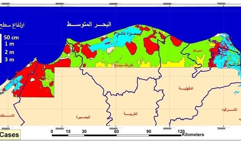 كذلك، أوضح أن العديد من الدراسات أجريت حول سيناريوهات ارتفاع منسوب سطح البحر وتأثر الدلتا، ووجدت أنه إذا ازداد منسوب سطح البحر نصف متر، فسيُغرق حوالي نصف مليون فدان شمال الدلتا ويضاعف حجم البحيرات الشمالية المنزلة والبرلس، وإدكو ومريوط، ومساحات كبيرة من بورسعيد ودمياط والإسكندرية، كما ستهجر حوالي 4 ملايين نسمة.