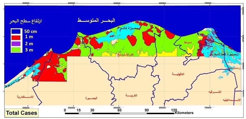 كذلك، أوضح أن العديد من الدراسات أجريت حول سيناريوهات ارتفاع منسوب سطح البحر وتأثر الدلتا، ووجدت أنه إذا ازداد منسوب سطح البحر نصف متر، فسيُغرق حوالي نصف مليون فدان شمال الدلتا ويضاعف حجم البحيرات الشمالية المنزلة والبرلس، وإدكو ومريوط، ومساحات كبيرة من بورسعيد ودمياط والإسكندرية، كما ستهجر حوالي 4 ملايين نسمة.