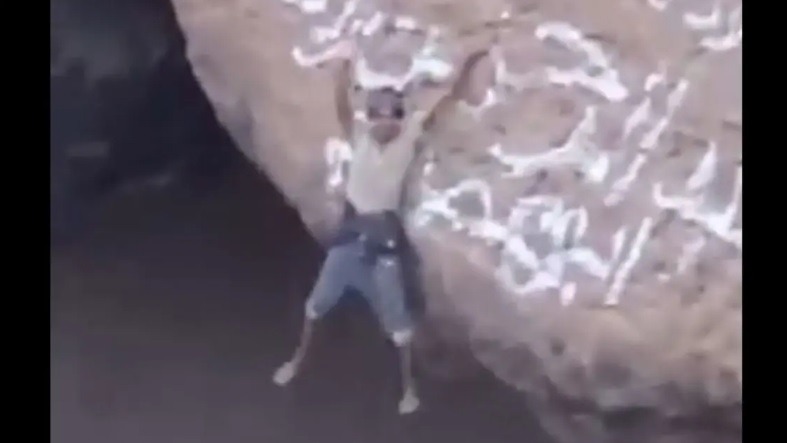 وفي فيديو يخطف الأنفاس، تدلى الشاب بقدميه عند آخر نقطة يصل إليها، راكضاً باتجاه الهاوية، إلى أن وقف عند أقرب نقطة للنار وبدأ يلوح بيديه منتصراً.
