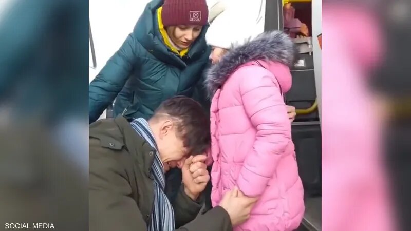 وظهر الأب الأوكراني وهو يودع طفلته التي تبدو وأنها في الخامسة أو السادسة من عمرها، حيث ألبسها قبعتها الشتوية وقبلها على خدها، ثم نزل على ركبتيه ليهمس شيئا لها، قبل أن ينهار في البكاء.