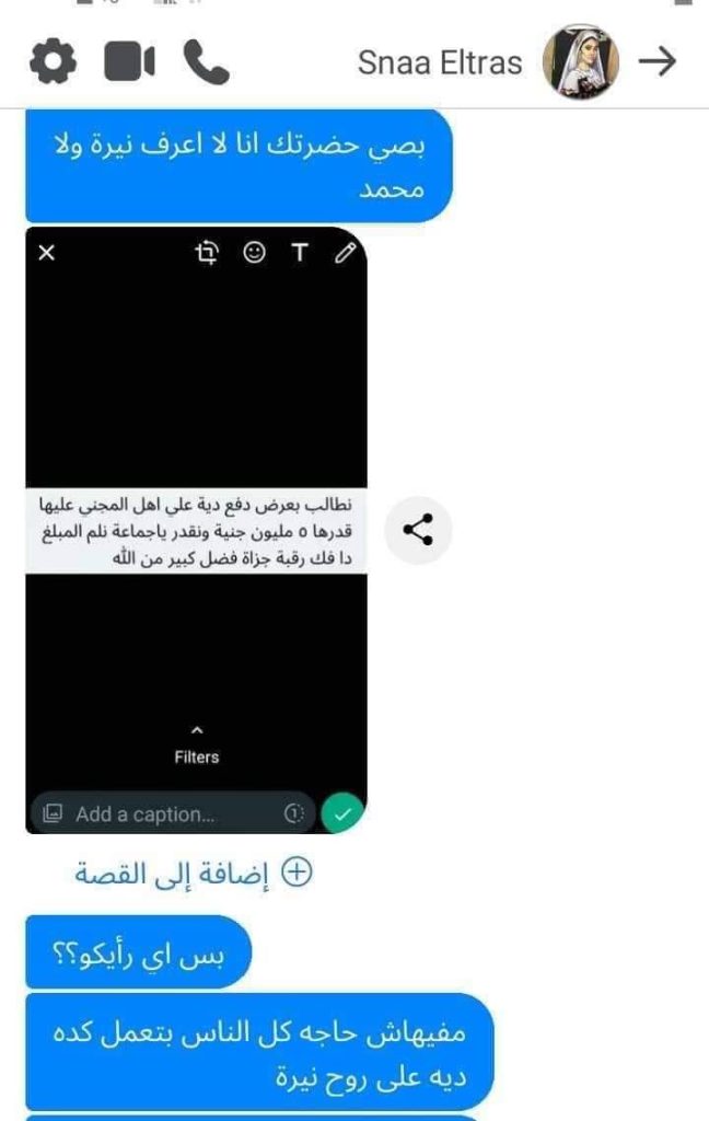 نشرت هدير أشرف شقيقة الطالبة نيرة أشرف طالبة المنصورة عبر صفحتها على مواقع التواصل الاجتماعي تكشف تفاصيل عرض دية عليهم مقابل التنازل عن قضية شقيقتها.