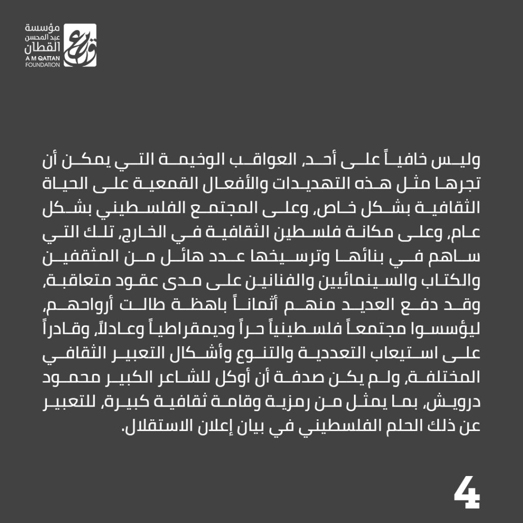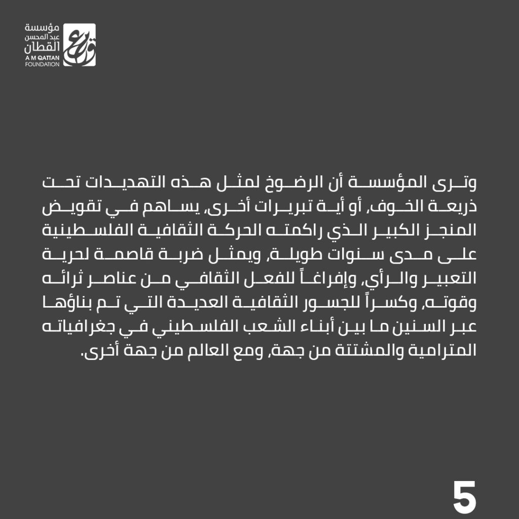 وترى المؤسسة أن الرضوخ لمثل هذه التهديدات تحت ذريعة الخوف، أو أية تبريرات أخرى، يساهم في تقويض المنجز الكبير الذي راكمته الحركة الثقافية الفلسطينية على مدى سنوات طويلة، ويمثل ضربة قاصمة لحرية التعبير والرأي، وإفراغاً للفعل الثقافي من عناصر ثرائه وقوته، وكسراً للجسور الثقافية العديدة التي تم بناؤها عبر السنين ما بين أبناء الشعب الفلسطيني في جغرافياته المترامية والمشتتة من جهة، ومع العالم من جهة أخرى.
