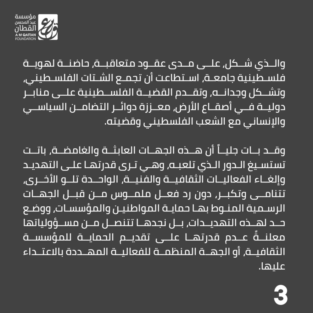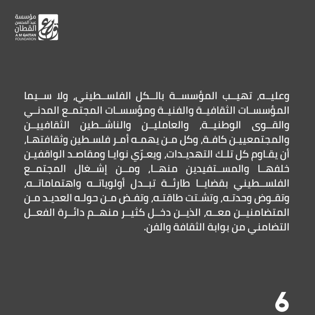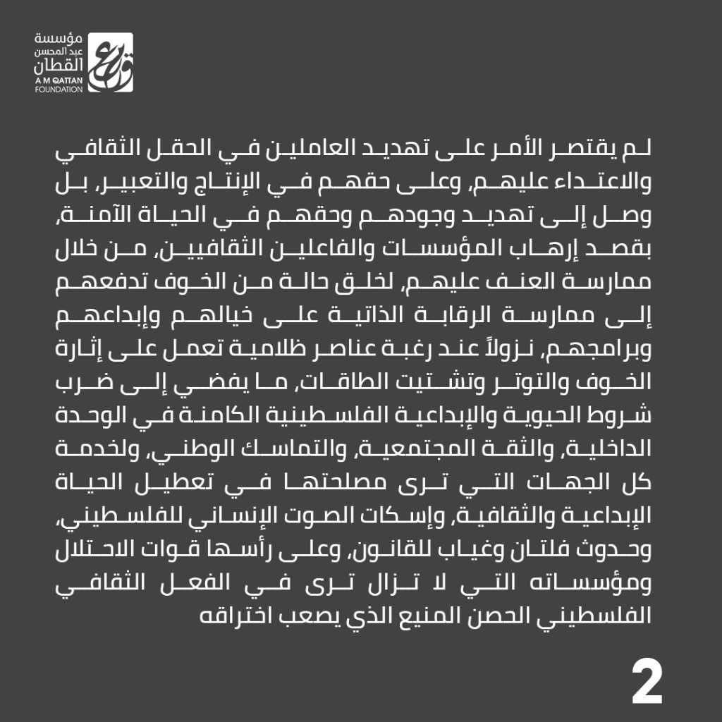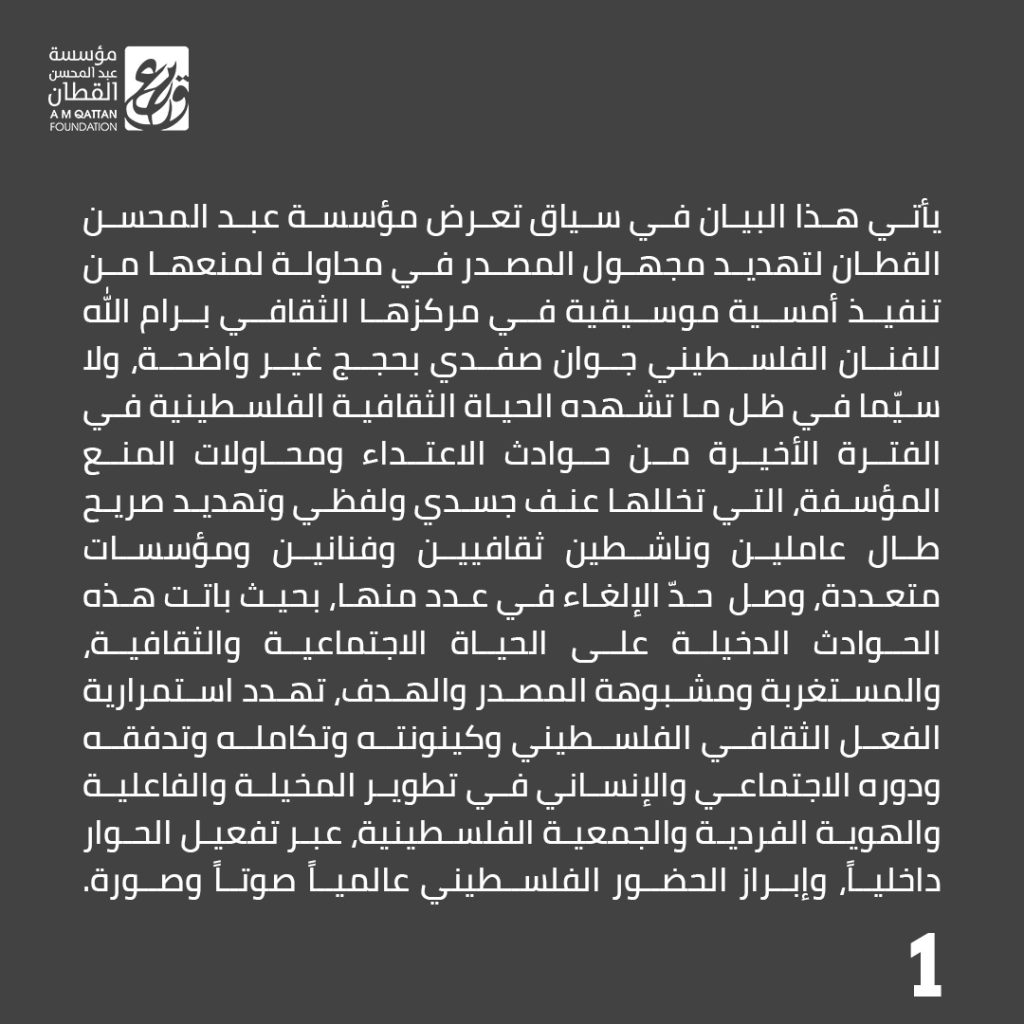 يأتي هذا البيان في سياق تعرض مؤسسة عبد المحسن القطان لتهديد مجهول المصدر في محاولة لمنعها من تنفيذ أمسية موسيقية في مركزها الثقافي برام الله للفنان الفلسطيني جوان صفدي بحجج غير واضحة، ولا سيّما في ظل ما تشهده الحياة الثقافية الفلسطينية في الفترة الأخيرة من حوادث الاعتداء ومحاولات المنع المؤسفة، التي تخللها عنف جسدي ولفظي وتهديد صريح طال عاملين وناشطين ثقافيين وفنانين ومؤسسات متعددة، وصل  حدّ الإلغاء في عدد منها، بحيث باتت هذه الحوادث الدخيلة على الحياة الاجتماعية والثقافية، والمستغربة ومشبوهة المصدر والهدف، تهدد استمرارية الفعل الثقافي الفلسطيني وكينونته وتكامله وتدفقه ودوره الاجتماعي والإنساني في تطوير المخيلة والفاعلية والهوية الفردية والجمعية الفلسطينية، عبر تفعيل الحوار داخلياً، وإبراز الحضور الفلسطيني عالمياً صوتاً وصورة.