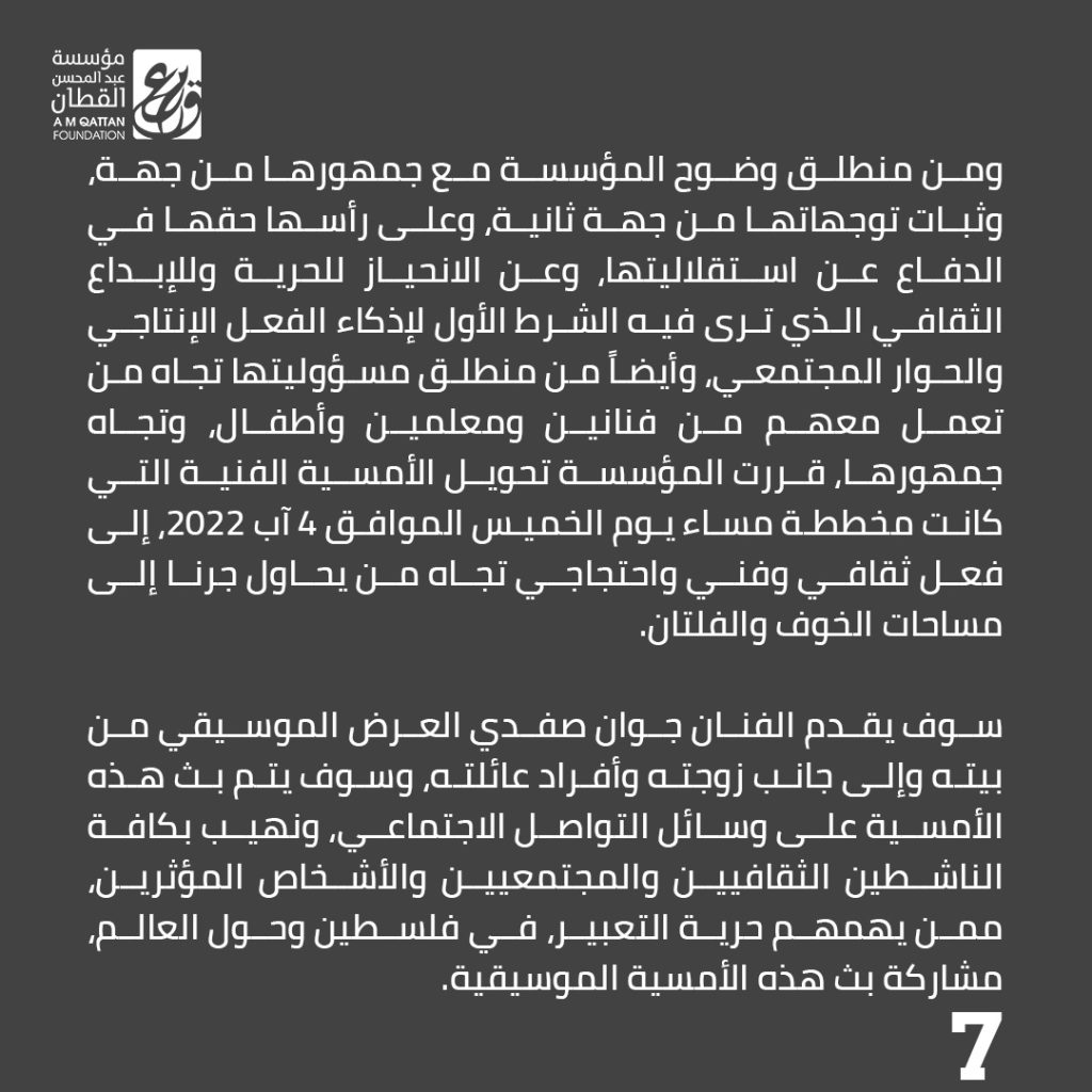 ومن منطلق وضوح المؤسسة مع جمهورها من جهة، وثبات توجهاتها من جهة ثانية، وعلى رأسها حقها في الدفاع عن استقلاليتها، وعن الانحياز للحرية وللإبداع الثقافي الذي ترى فيه الشرط الأول لإذكاء الفعل الإنتاجي والحوار المجتمعي، وأيضاً من منطلق مسؤوليتها تجاه من تعمل معهم من فنانين ومعلمين وأطفال، وتجاه جمهورها، قررت المؤسسة تحويل الأمسية الفنية التي كانت مخططة مساء يوم الخميس الموافق 4 آب 2022، إلى فعل ثقافي وفني واحتجاجي تجاه من يحاول جرنا إلى مساحات الخوف والفلتان.  سوف يقدم الفنان جوان صفدي العرض الموسيقي من بيته وإلى جانب زوجته وأفراد عائلته، وسوف يتم بث هذه الأمسية على وسائل التواصل الاجتماعي، ونهيب بكافة الناشطين الثقافيين والمجتمعيين والأشخاص المؤثرين، ممن يهمهم حرية التعبير، في فلسطين وحول العالم، مشاركة بث هذه الأمسية الموسيقية.