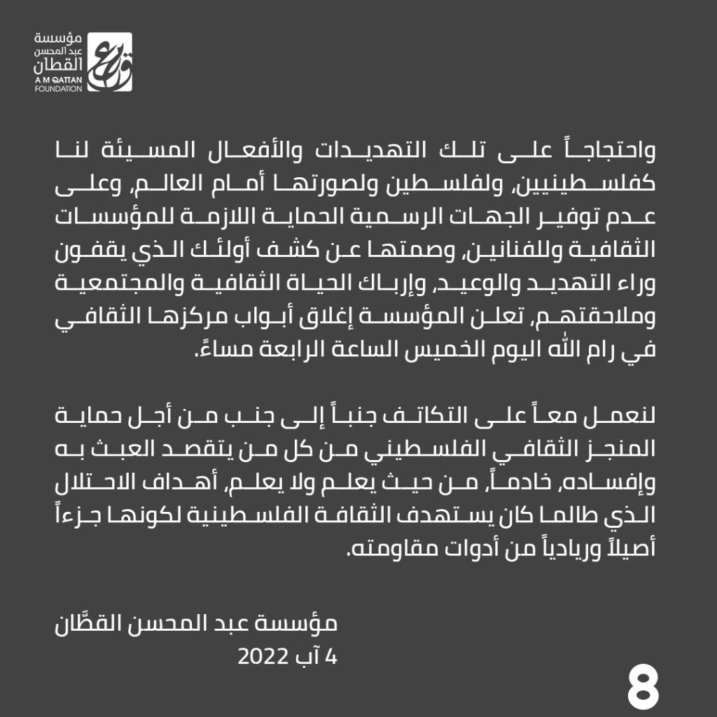 واحتجاجاً على تلك التهديدات والأفعال المسيئة لنا كفلسطينيين، ولفلسطين ولصورتها أمام العالم، وعلى عدم توفير الجهات الرسمية الحماية اللازمة للمؤسسات الثقافية وللفنانين، وصمتها عن كشف أولئك الذي يقفون وراء التهديد والوعيد، وإرباك الحياة الثقافية والمجتمعية وملاحقتهم، تعلن المؤسسة إغلاق أبواب مركزها الثقافي في رام الله اليوم الخميس الساعة الرابعة مساءً.