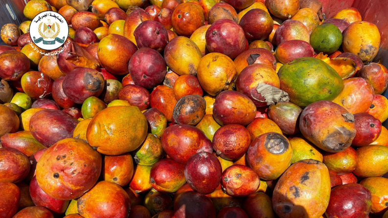 ضبط جهاز الضابطة الجمركية، بالتعاون مع جهة الاختصاص في صحة بلدية جنين _ قسم الرقابة الغذائية، اليوم الثلاثاء، 2 طن ونصف فواكه (مانجا) غير صالحة للاستهلاك الآدمي؛ نتيجة لظهور علامات تدل على فسادها، حيث أن تناولها قد ينجم عنه مخاطر صحية كبيرة على المستهلكين.