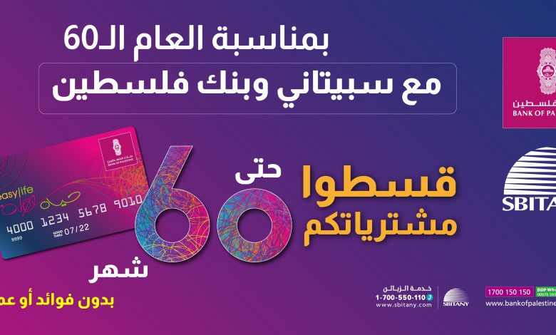 أطلق بنك فلسطين وبالشراكة مع شركة أكرم سبيتاني وأولاده، حملةً مميّزة ترفع شعار “60” احتفالاً بمرور 60 عاماً على تأسيس بنك فلسطين والذي تصادف هذا العام وتزامناً مع الذكرى الستون لتأسيس شركة أكرم سبيتاني وأولاده، حيث تتيح الحملة لمستخدمي بطاقة ايزي لايف الحاليين والجدد، إمكانية تقسيط المشتريات حتى 60 شهراً وبدون أي فوائد وعمولات، وذلك عند الشراء بقيمة 6 آلاف شيكل أو أكثر عبر بطاقة ايزي لايف من فروع ومسوقي شركة أكرم سبيتاني وأولاده المنتشرة في القدس والضفة الغربية وقطاع غزة.