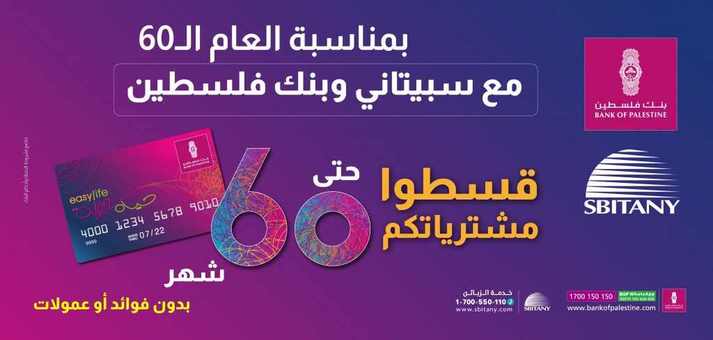 أطلق بنك فلسطين وبالشراكة مع شركة أكرم سبيتاني وأولاده، حملةً مميّزة ترفع شعار “60” احتفالاً بمرور 60 عاماً على تأسيس بنك فلسطين والذي تصادف هذا العام وتزامناً مع الذكرى الستون لتأسيس شركة أكرم سبيتاني وأولاده، حيث تتيح الحملة لمستخدمي بطاقة ايزي لايف الحاليين والجدد، إمكانية تقسيط المشتريات حتى 60 شهراً وبدون أي فوائد وعمولات، وذلك عند الشراء بقيمة 6 آلاف شيكل أو أكثر عبر بطاقة ايزي لايف من فروع ومسوقي شركة أكرم سبيتاني وأولاده المنتشرة في القدس والضفة الغربية وقطاع غزة.