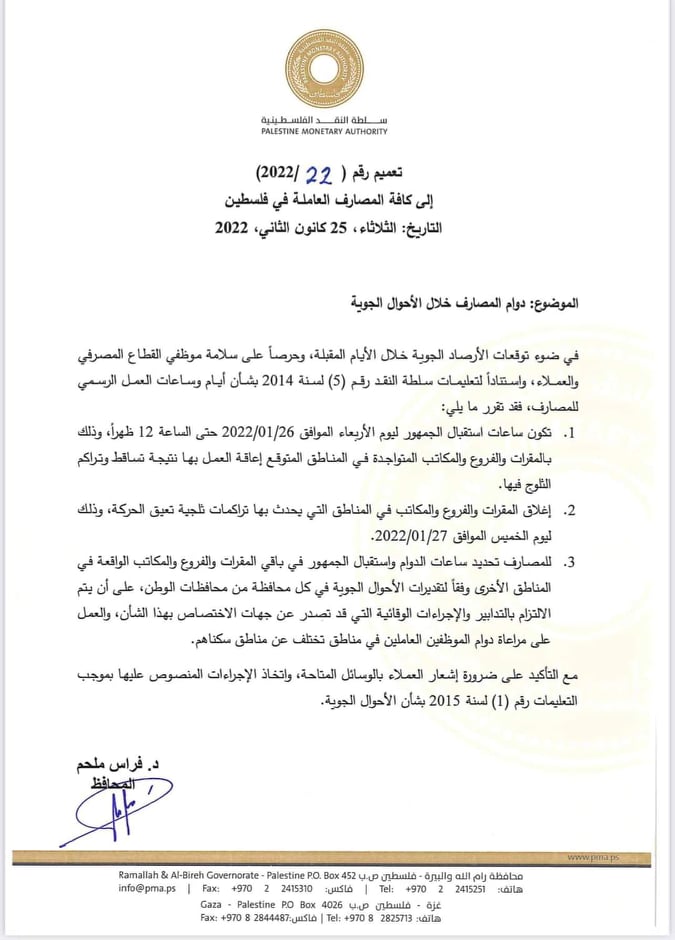 سلطة النقد تعلن عن دوام المصارف خلال المنخفض الجوي القادم