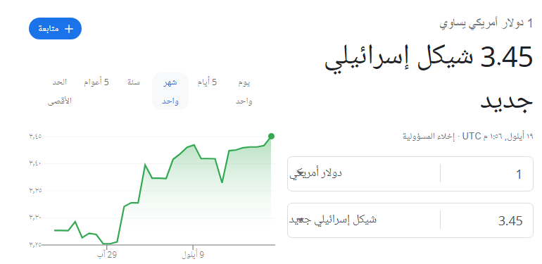 شهد سعر صرف الدولار مقابل الشيكل، ظهر اليوم الاثنين، 19 سبتمبر 2022، ارتفاعا جديدا في التداولات المصرفية المسائية، مقارنة بما كان عليه في ساعات الصباح الأولى.