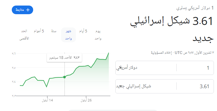 بحسب المعلومات الرسمية المتوفرة، وصل سعر صرف الدولار الأمريكي الآن كما يظهر على الشاشة إلى 3.61 شيكل إسرائيلي، في ارتفاع جديد عن ساعات الصباح.