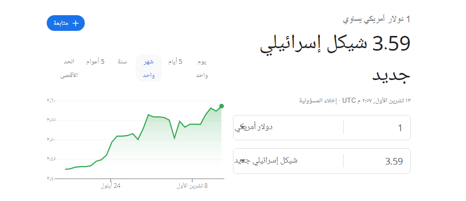 ووصل سعر صرف الدولار مقابل الشيكل الاسرائيلي، الآن، 3.59 شيكل.