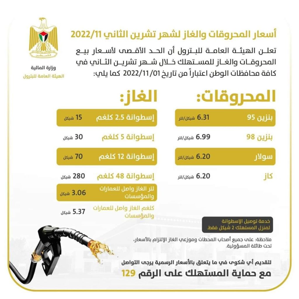 وبينت أن لتر البنزين 95 سيباع بـ6.31 شيقل، ولتر البنزين 98 بـ99. 6 شيقل، ولتر السولار والكاز بـ6.20 شيقل، واسطوانة الغاز 12 كيلوغرام بـ70 شيقلا.