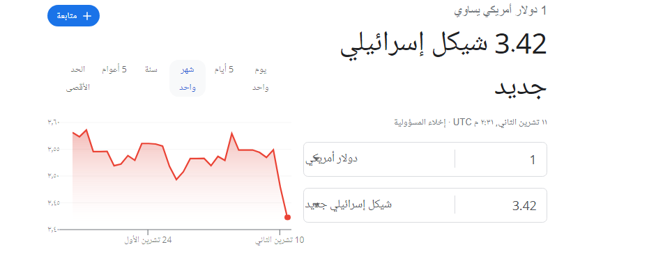 والساعة الرابعة مساء اليوم ، يظهر على الشاشة “البورصة” أن الدولار الأمريكي يصرف مقابل 3.42 شيكل في انخفاض مقداره 4 أغورات عن السعر في ساعات الصباح.