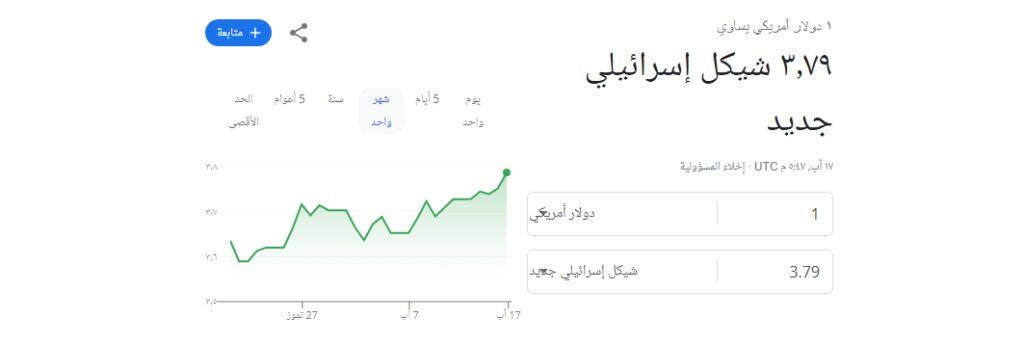 ووصل سعر صرف الدولار مقابل الشيكل الآن إلى 3.79 شيكل، فيما كان في ساعات الصباح 3.76.