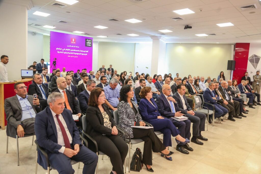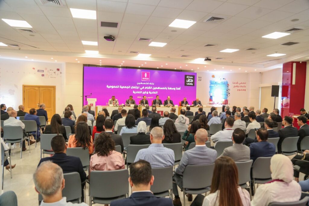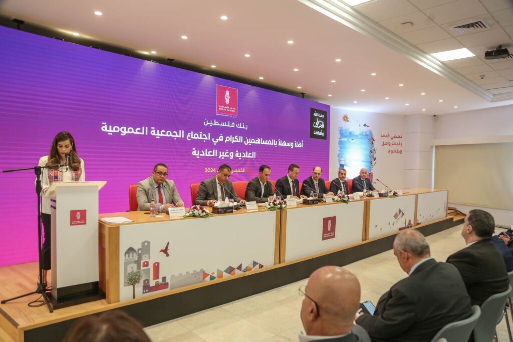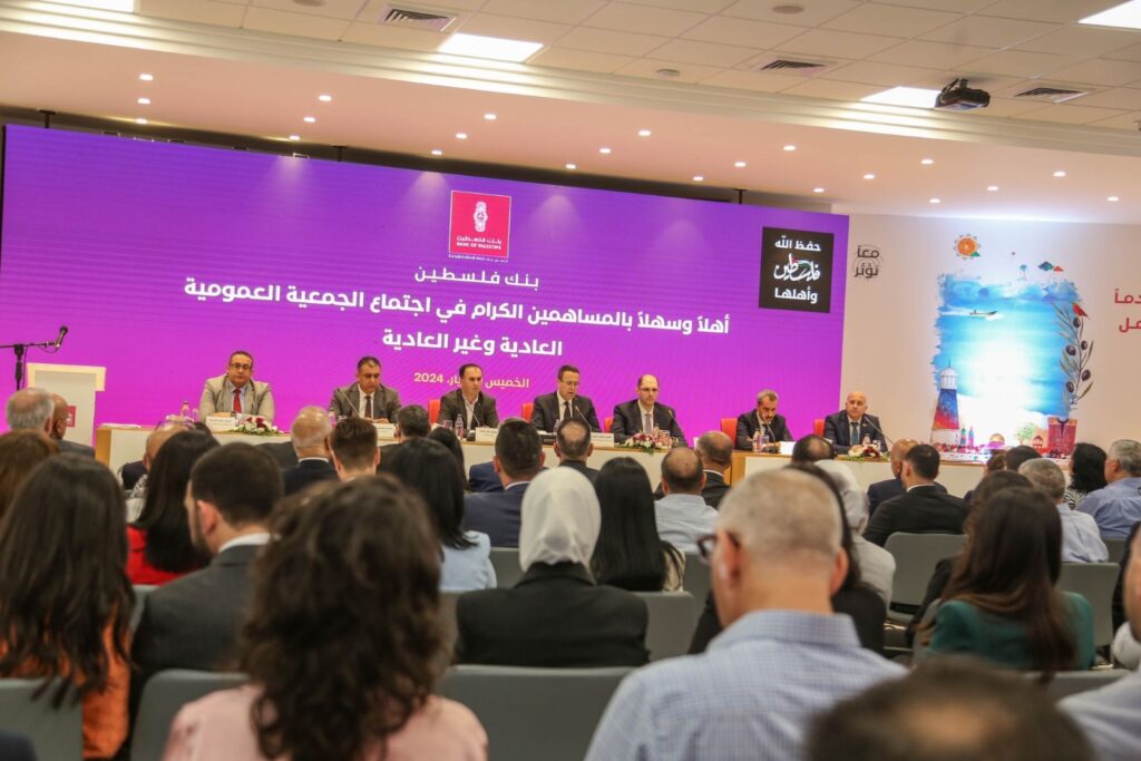 عقدت الجمعية العمومية لبنك فلسطين اليوم الخميس الموافق 30/05/2024، اجتماعها السنوي العادي وغير العادي في مقر المركز الرئيسي للإدارة العامة للبنك، بمدينة رام الله، وذلك بحضور السيد هاشم الشوا، رئيس مجلس إدارة مجموعة بنك فلسطين، والسيد محمود الشوا المدير العام، وأعضاء مجلس الإدارة، ومسجل الشركات في وزارة الاقتصاد الوطني، وسلطة النقد، وهيئة سوق رأس المال الفلسطينية، والمدقق الخارجي للحسابات، وعدد كبير من المساهمين بنسبة نصاب بلغت حوالي 71.91%.
