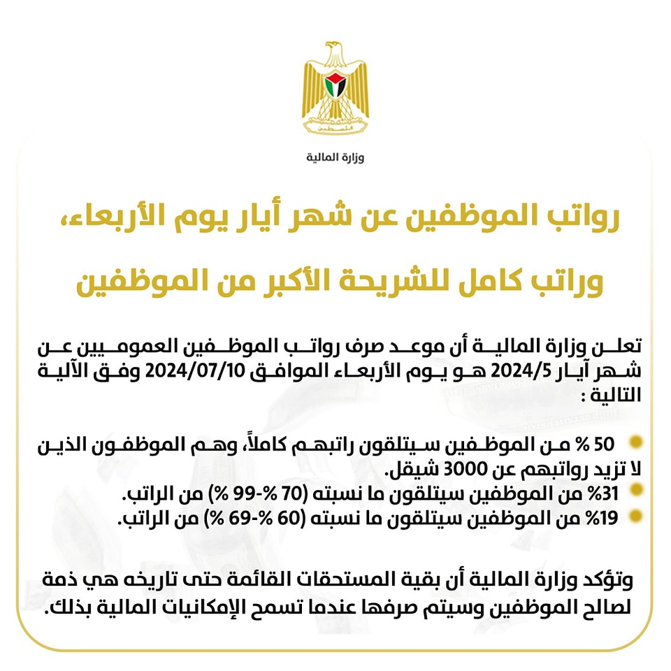 أعلنت وزارة المالية، مساء اليوم الاثنين، أن موعد صرف رواتب الموظفين العموميين عن شهر أيار 5/2024 هو يوم الأربعاء الموافق 10/7/2024، وفق الآلية التالية: