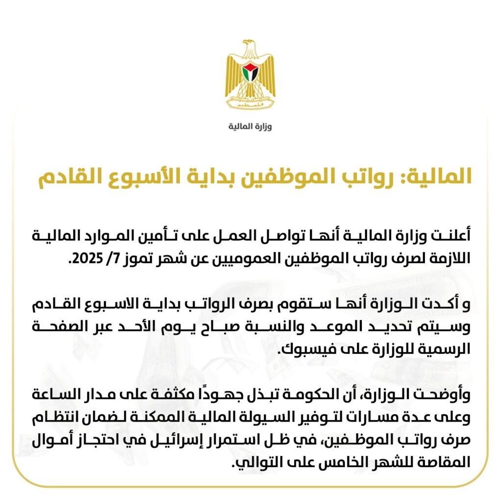 أعلنت وزارة المالية أنها تواصل العمل على تأمين الموارد المالية اللازمة لصرف رواتب الموظفين العموميين عن شهر تموز 7/ 2025.