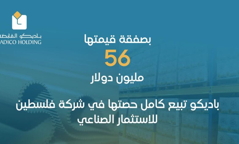 أعلنت شركة فلسطين للتنمية والاستثمار (باديكو) عن بيع كامل حصتها في شركة فلسطين للاستثمار الصناعي والبالغة 56% لشركات المساهم نضال السختيان، وقد تم تنفيذ الصفقة على بورصة فلسطين بقيمة 56 مليون دولار.