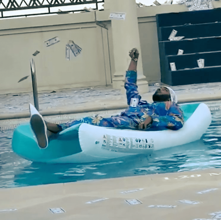 وظهر محمد رمضان في الفيديو، وحوله الكثير من الدولارات في حمام السباحة، حيث قام برمي الدولارات حوله في كل مكان.