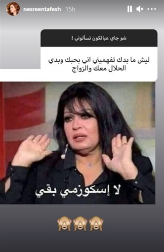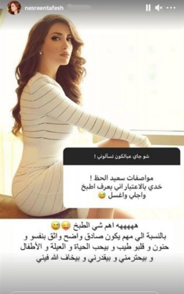 وكتبت نسرين عبر خاصية الستوري: “يكون صادق وواضح وواثق من نفسه وحنون وقلبه طيب، يحب الحياة والعائلة والأطفال ويحترمني ويقدرني ويخاف الله في”.