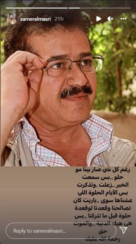 وشارك سامر صورة للراحل المخرج السوري بسام الملا وكتب: “رغم كل شي مو حلو صار بيني وبينك..بس سمعت الخبر..زعلت..وتذكرت بس الأيام الحلوة اللي عشناها سوى يا ريت كنا تصالحنا وقعدنا عالأقل قعدة حلوة قبل ما تتركنا..بس هي هيك..الدنية والموت حق رحمة الله عليك”.