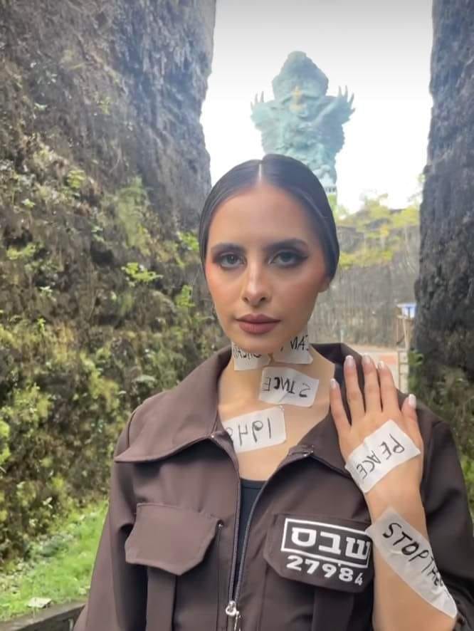 ووقفت لورين أمام تمثال جارودا ويسنو كينكانا الموجود في حديقة جارودا ويسنو كينكانا الثقافية في بالي مرتدية ملابس الأسير الفلسطيني وقد كُتب عليه عبارة Free Palestine أي فلسطين حرة.
