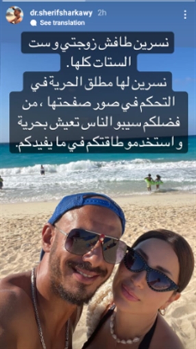 ونشر شريف صورة تجمعه بزوجته نسرين طافش، عبر خاصية ستورى على حسابه على إنستجرام، وكتب قائلا:”نسرين طافش زوجتى وست الستات كلها ولها مطلق الحرية فى التحكم في صور صفحتها، من فضلكم سيبوا الناس تعيش بحريتها، واستخدموا طاقتكم فيما يفيدكم”.
