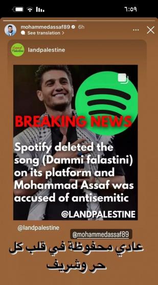 وجاء في حديث عساف: ”هذا الفعل الذي قامت به “سبوتيفاي” و”آبل ميوزيك”، يدلّ على معاداتهما هما ومن يسير على خطاهما للحرية والعدالة ولقضية فلسطين الحرة الشريفة، ولكل حر شريف ينادي بالحرية في هذا العالم المختل”.