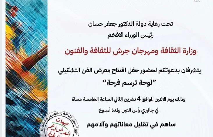 عمان – (التاريخ) تحت رعاية دولة رئيس الوزراء الدكتور جعفر حسان، وبالتنظيم المشترك لوزارة الثقافة ومهرجان جرش للثقافة والفنون. يفتتح يوم الاثنين 4-11-2024 ولمدة اسبوع معرض “لوحة ترسم فرحة” في جاليري راس العين، حيث يأتي هذا المعرض الفني افي إطار التضامن مع أطفال غزة، يتضمن مجموعة متنوعة من اللوحات الفنية التي أنجزها فنانون أردنيون وعرب من نتاج مشاركتهم بمهرجان جرش للثقافة والفنون في دورته الأخيرة 2024.
