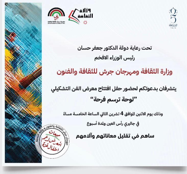 عمان – (التاريخ) تحت رعاية دولة رئيس الوزراء الدكتور جعفر حسان، وبالتنظيم المشترك لوزارة الثقافة ومهرجان جرش للثقافة والفنون. يفتتح يوم الاثنين 4-11-2024 ولمدة اسبوع معرض “لوحة ترسم فرحة” في جاليري راس العين، حيث يأتي هذا المعرض الفني افي إطار التضامن مع أطفال غزة، يتضمن مجموعة متنوعة من اللوحات الفنية التي أنجزها فنانون أردنيون وعرب من نتاج مشاركتهم بمهرجان جرش للثقافة والفنون في دورته الأخيرة 2024.