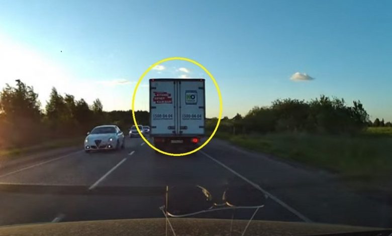 ويُظهر الفيديو شاحنة بيضاء، تسير على طريق ذي اتجاهين بسرعة 60 كيلومترًا، وفي لحظة ما يضطر قائد الشاحنة إلى التهدئة والانحراف يسارًا؛ لنكتشف وجود سيارة زرقاء تقف بعرض الطريق. وكادت الشاحنة أن تصطدم بالسيارة الزرقاء، لكن المناورة الناجحة لقائد الشاحنة انتهت بكسر جزء من المصد الأمامي للسيارة، وتفادي اصطدام قاتل بين السيارتين. ولم يصب أحد في الحادث.