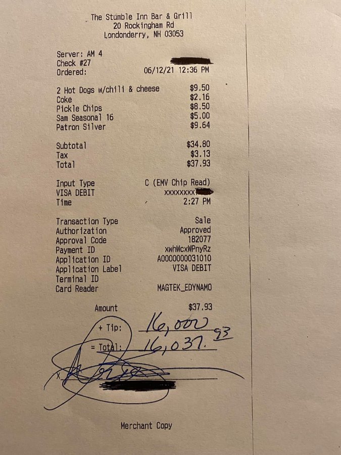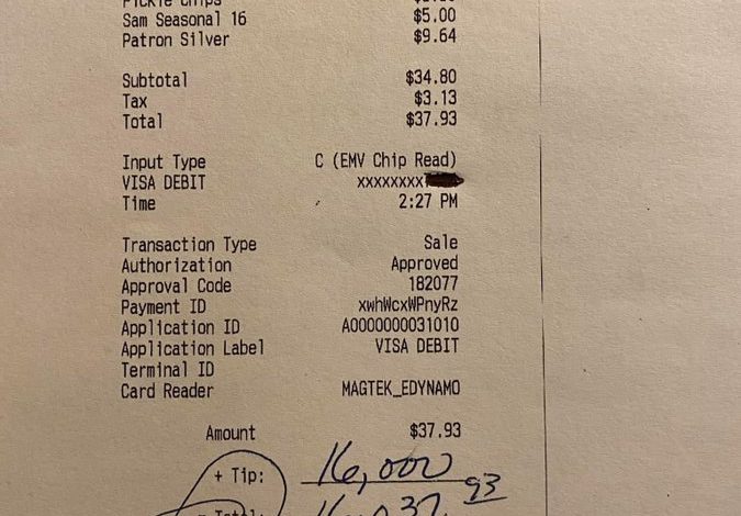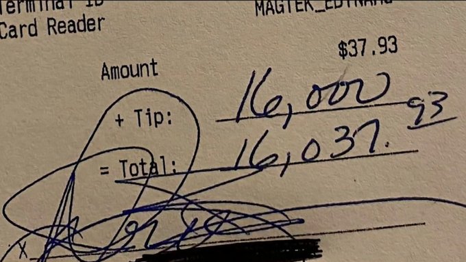 وكانت قيمة الفاتورة 37،93 دولاراً، في مقابل ما طلبه. وقد أصبحت قيمتها مع الإكرامية السخية 16037،93 دولاراً.