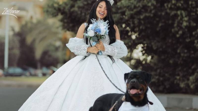 نشرت المدونة المصرية هبة مبروك صور لها عبر حسابهاعلى إنستجرام برفقة كلب وعلقت في عنقه لافتة حفل الزواج.