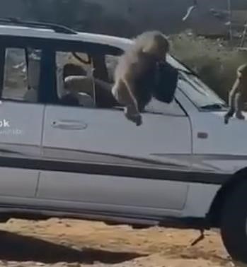 ويظهر في الفيديو توثيق لحظة سرقة مجموعة من القرود في مدينة الطائف حقيبة سيدة من سيارة كانت متوقفة في منطقة جبلية اثناء رحلة للعائلة.