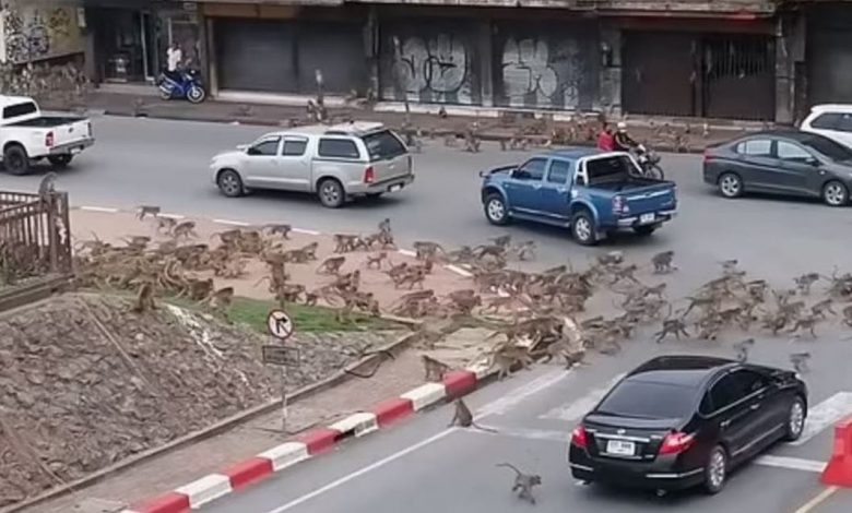 تلفزيون الفجر | في حادث غريب، وقعت معركة شرسة بين عصابتين من القرود في أحد شوارع منطقة تبعد حوالي 100 ميل شمال العاصمة التايلاندية بانكوك.