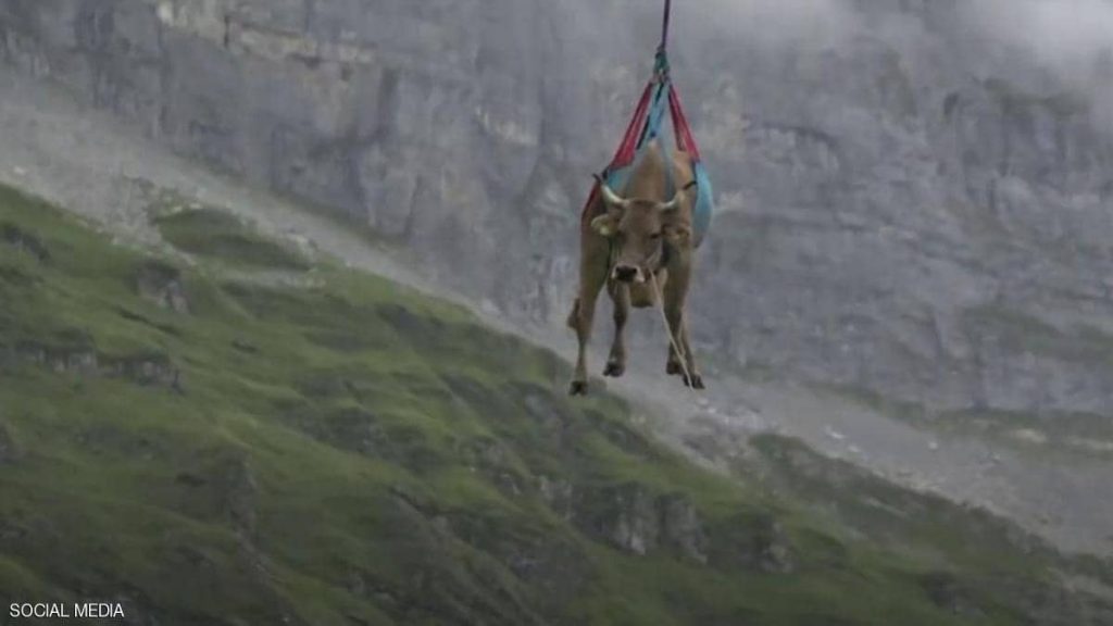 وأظهر مقطع فيديو نقل بقرة بمروحية فوق تلال منطقة كلاوسنباس، وسط سويسرا.