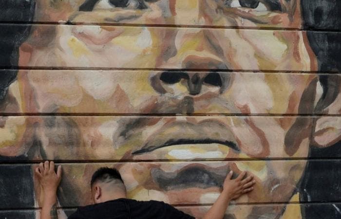 أحد المشجعين يبكي مارادونا عند صورة له بالشارع