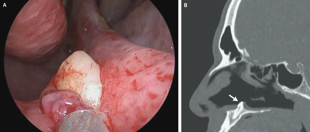 وكشف الفحص عن حاجز منحني متشكل من “كتلة بيضاء صلبة” في فتحة الأنف، وأكد التصوير المقطعي أن السن هو سبب صعوبة التنفس.