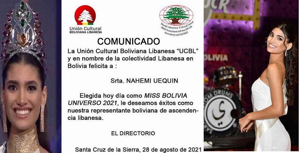 أما ناهيمي يواكيم، ملكة جمال بوليفيا، فملمة بالإسبانية والإنجليزية والألمانية، وحين فازت في أغسطس الماضي باللقب، أصدر “الاتحاد الثقافي اللبناني البوليفي” بيانا تنشر “العربية.نت” صورة عنه أدناه، وسبق أن انتشرت في مواقع التواصل، وذكر فيه ما قالته هي نفسها في مقابلات صحافية عدة معها، من أن والدتها فنزويلية ووالدها “كارلوس يواكيم” متحدر بدوره من أب لبناني مهاجر.