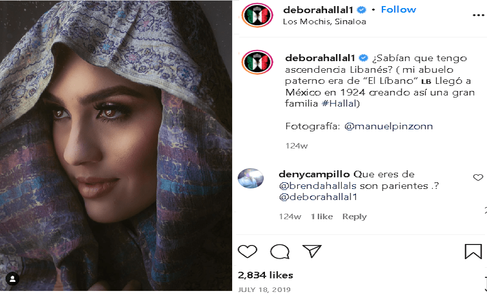 ديبورا هلال، الملمة بالإسبانية والإنجليزية، والحاصلة من جامعة TecMilenio المحلية على بكالوريس بإدارة الأعمال، نشرت في يونيو الماضي صورة لها، شرقية الطراز، وكتبت إلى جانبها بموقع Instagram التواصلي، أنها متحدرة من أصل لبناني، وأن جدها لأبيها “كان من لبنان، ووصل في 1924 إلى المكسيك، حيث ربى عائلة كبيرة.. عائلة هلال” فنالت بما كتبته، وفقا لما يظهر بالصورة المنشورة أعلاه، إعجاب 2.834 من متابعيها البالغين 267 ألفا.