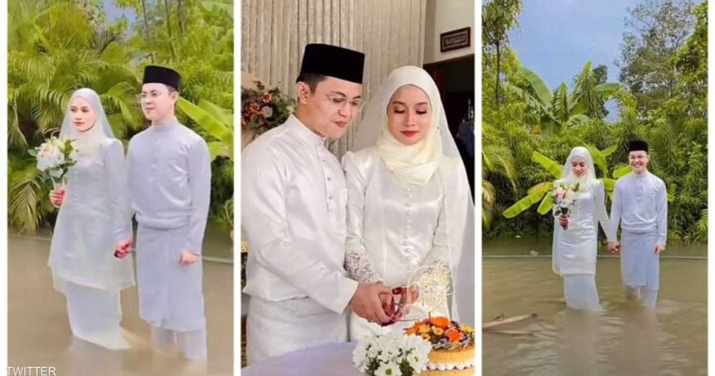 وأشعل زوجان من ماليزيا الإنترنت، عندما ظهرا بلقطات وهم يقومان بطقوس الزفاف التقليدي، وسط مياه مرتفعة تصل للركبة، جراء الفيضانات، بينما اعتلت وجهيهما ابتسامتان عريضتان.