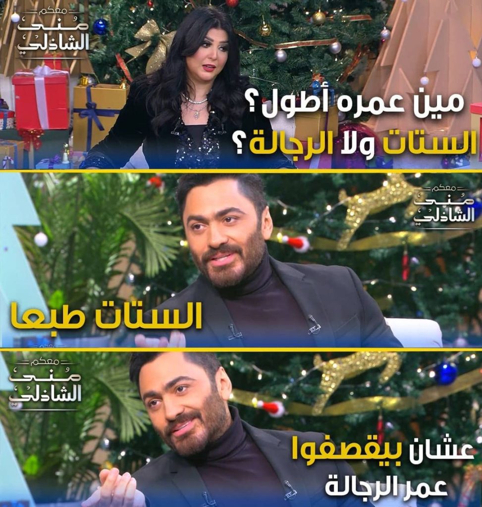 وبرر تامر حسني إجابته، قائلا: “الرجالة بتموت قبل الستات علشان الستات بتقصف عمر الرجالة الصراحة”.