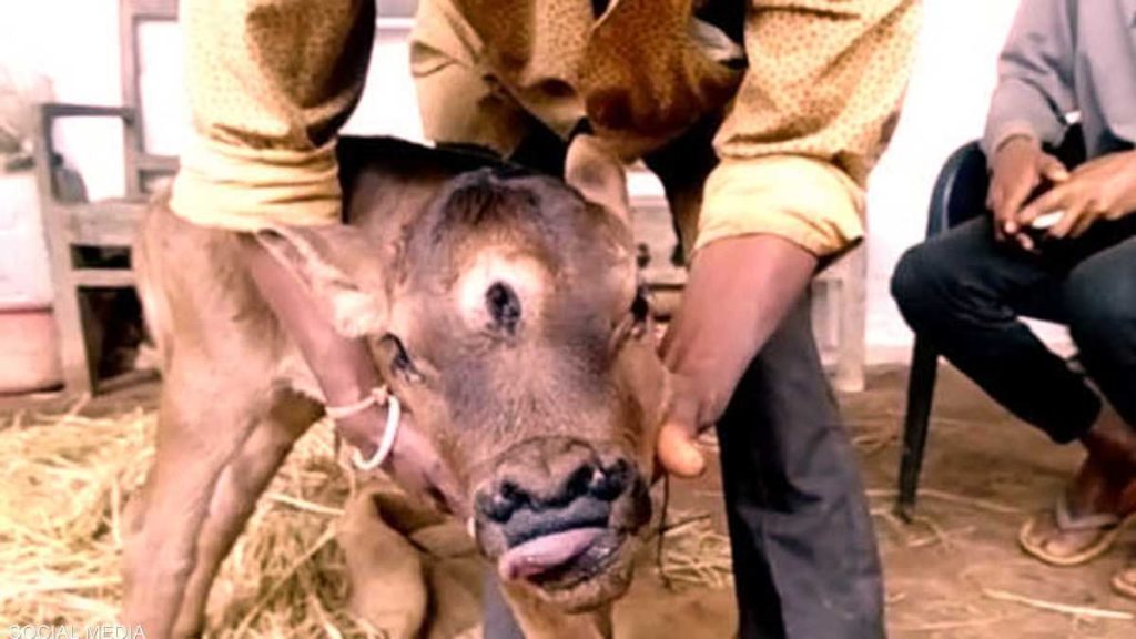 أثارت ولادة عجل بثلاثة عيون وأربع فتحات أنف دهشة واستغراب سكان مقاطعة راجناندجاون الهندية.