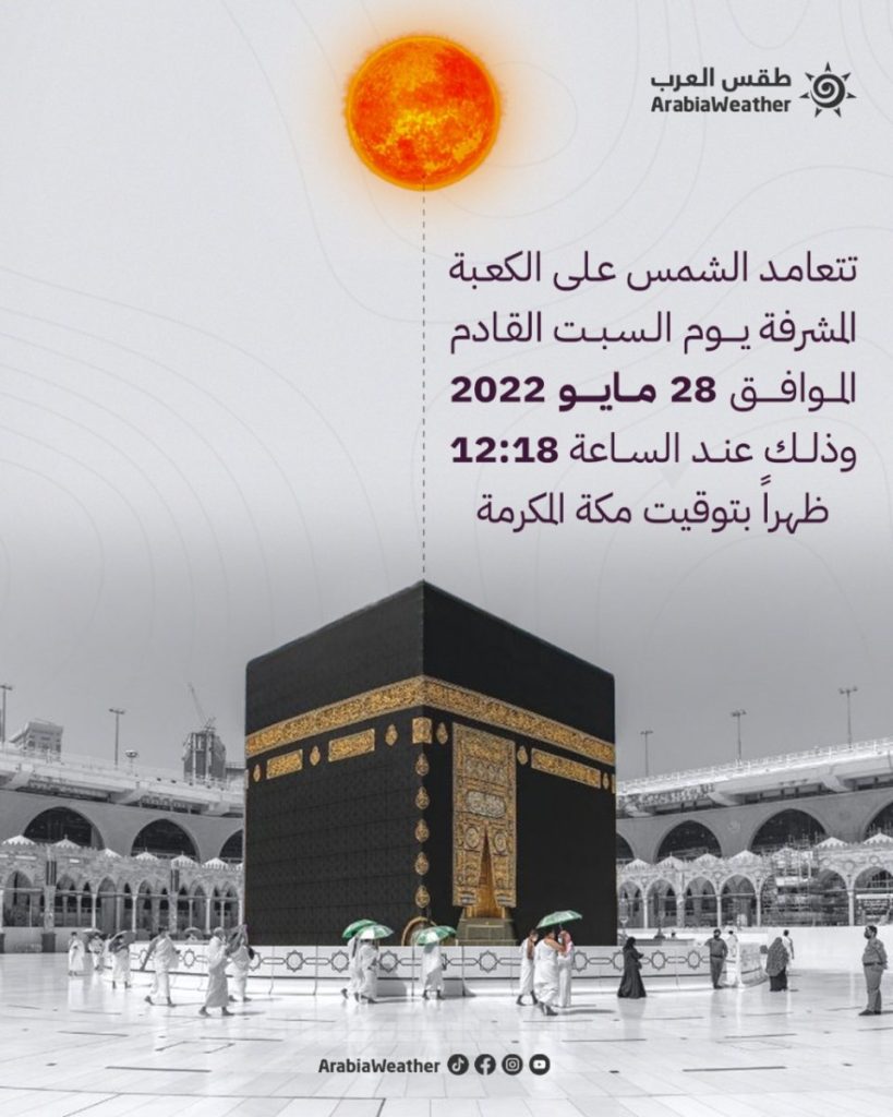 للمرة الأولى هذا العام، من المُنتظر أن تتعامد الشمس على الكعبة المشرفة ظهر يوم السبت القادم 28 مايو 2022م، حيث تكون الشمس عامودية فوق الكعبة المشرفة، مُتسببة باختفاء ظل الكعبة المشرفة عن جوانبها الأربعه بشكل كامل.
