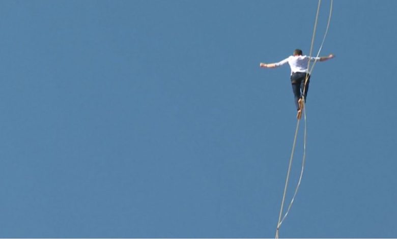 مغامر فرنسي يحقق رقماً قياسياً في المشي على حبل بين قمتين.. فيديو